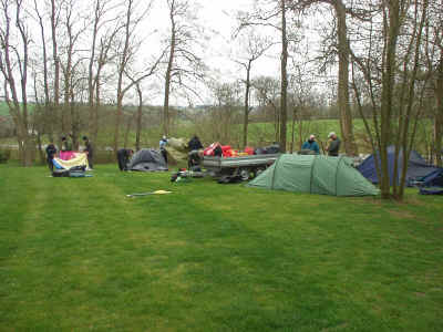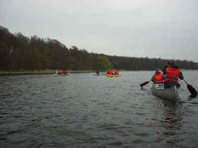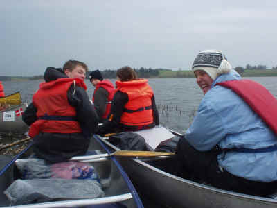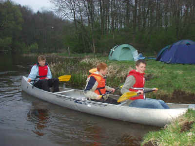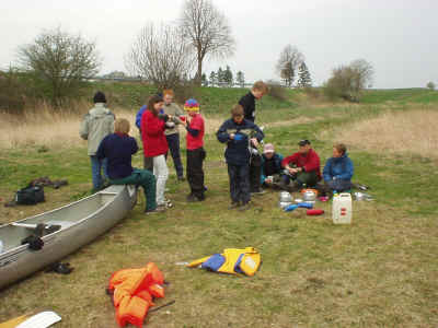 Lørdag: Den nye dag er oprandt, og der bliver spist en hurtig omgang morgenmad, og så af sted til åen. Vi har desværre ikke haft vejrguderne på vores side, da det har vist sig at blive køligt og blæsende hele weekenden, men er vi spejdere eller ej? Dette spørgsmål kunne ingen af os svarer på, men vi blev enige om at det er man vist, hvis man bruger en hel weekend på at sejle i kano i skodvejr. Det helt store spørgsmål var stadig om vi kunne krydse den foreliggende sø i sikker stil, da vejret stadig var noget uregelmæssigt. Det viste sig heldigvis ikke at være noget problem med en hel flok af ”stærke”, og ”styrer sikre” spejdere. Der blev holdt en kort pause med frokost, og tilhørende hvil (hvilket jeg er sikker på at mange var glade for). Efter ca. 8 timers sejlads nåede vi til vores udpegede overnatningssted, selvom vi var lidt uenige om det var det rigtige sted. Så blev der slået telt op, vasket kanoer, og nogen startede på maden. Menuen stod på grillede svendepølser m. grillede pølse- brød. Dette var et måltid mange var glade for, selvom jeg tvivler lidt på dets kulinariske værdi. Resten af aftenen stod det på hygge om et ny anskaffet lejrbål, og andre sociale ting. Som eks. aftentur på åen hvilket de tre store drenge: Jakob, Niels og Morten benyttede sig af. |