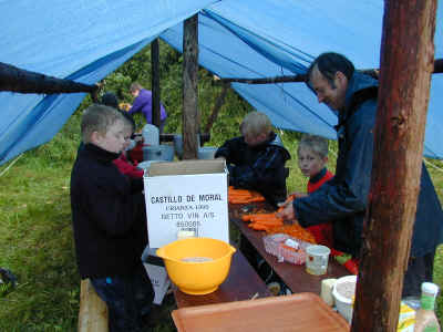 Så er vi nået til madtid den første dag. Det er godt nok vådt !