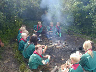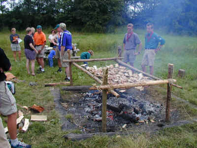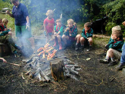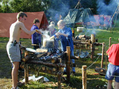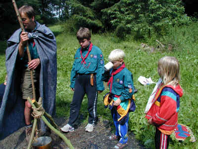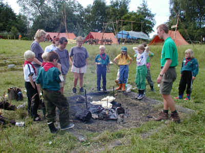 Mens nogle er på hike foregår der stadig noget i lejren. Her er spejdertroppens ledere i gang med at lave frokostbrød med ulvene. Man tager dejen og pakker pålægget ind i dejen. Derefter bages det over bålet til dejen er færdig. Spises mens det er varmt.