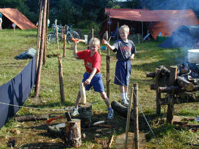 Juniortroppen er vel tilbage i lejren. Nu skal der hugges brænde til bålet.