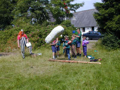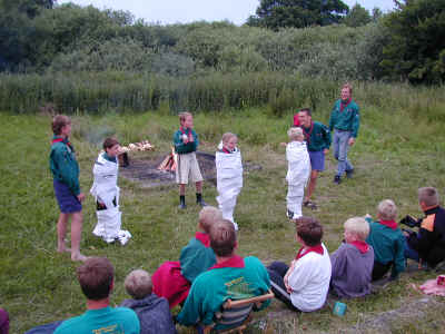 Ved et lejrbål foregår der mange lege og konkurrencer. Her er det en konkurrence i hurtigst muligt at mumificere en person vha. toiletpapir.